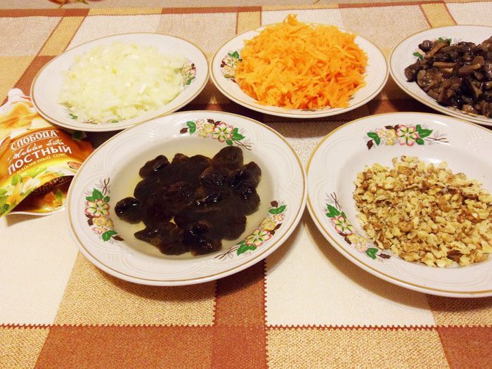 Грибы, лук очистить, помыть и мелко нарезать. Морковь очистить, помыть и натереть на крупной терке. Чернослив помыть и замочить в кипятке. Орехи измельчить.