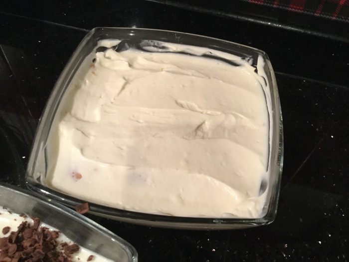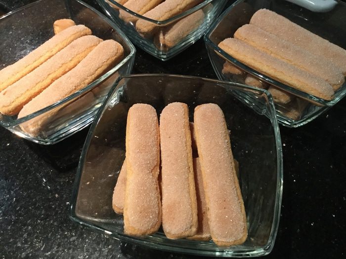 Возьмите одну пиалу диаметром 23 — 25 см или 4 порционные и уложите печенье слоями.