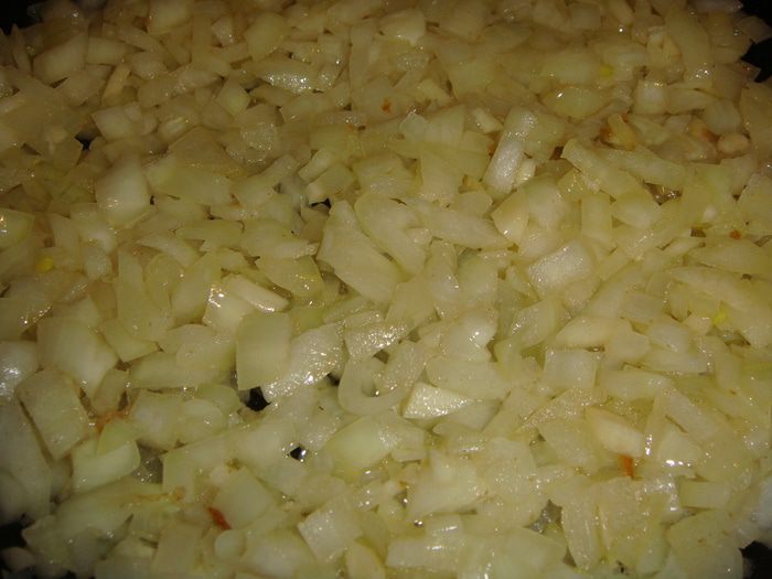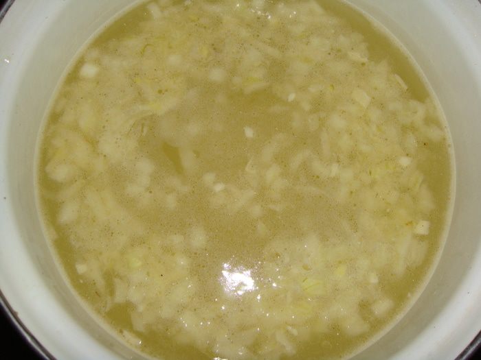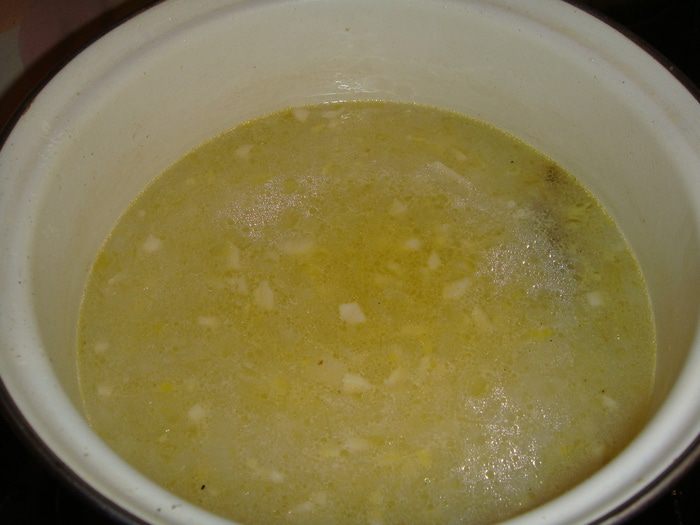 Бульон влить в кастрюлю, добавить обжаренный лук с чесноком и довести до кипения.