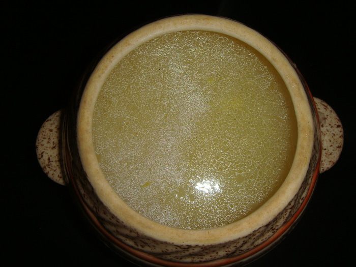 В горшочек поверх супа положить кусочек хлеба.