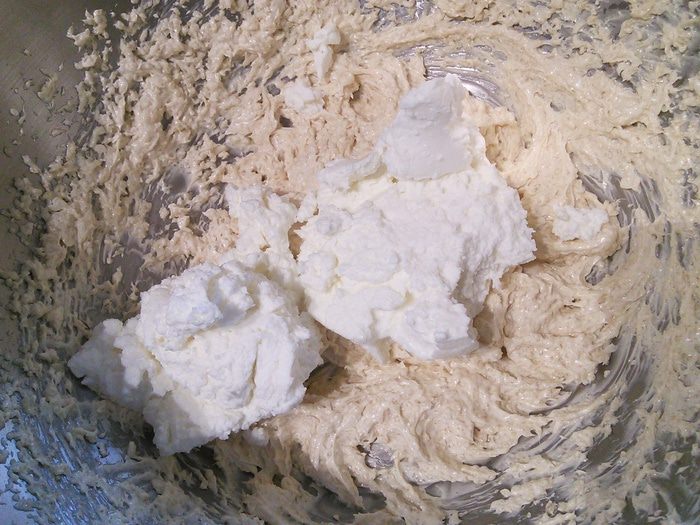 Добавить хорошо отвешенный мягкий однородный творог (у меня обезжиренный), хорошо взбить с маслом.