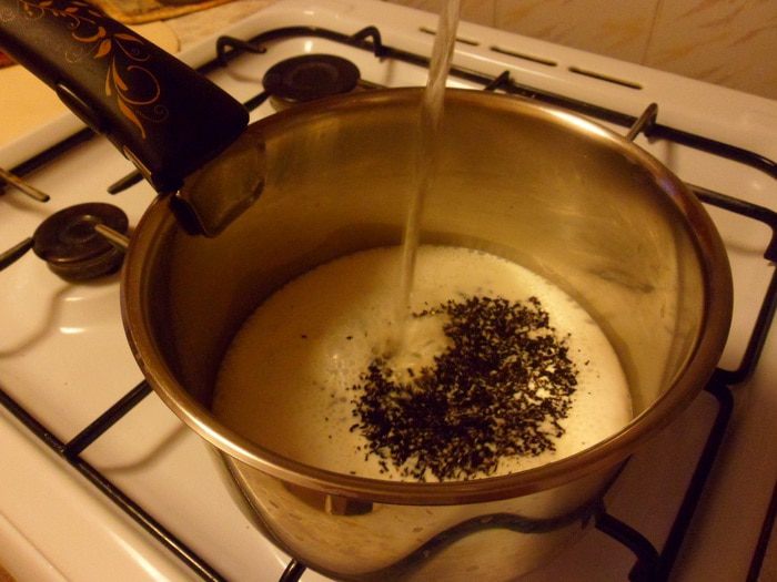 В кипящее молоко всыпать чай и сразу влить в кипящую воду.