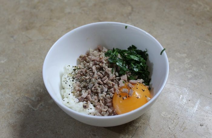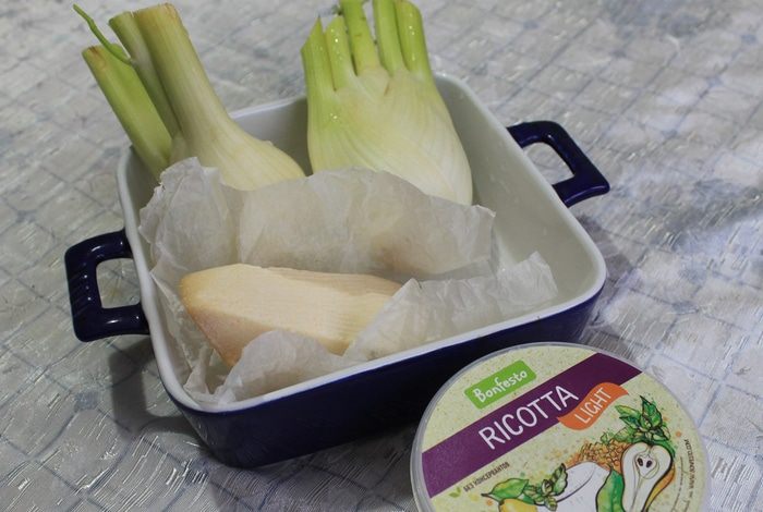 Пока отвариваете фенхель, можно приготовить начинку. Мелко нарежьте ветчину и зелень, измельченную сердцевину фенхеля, все добавьте к рикотте, вбейте желток, соль по вкусу и перец, перемешайте. Начинка готова.