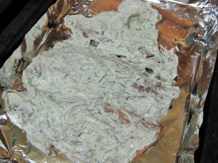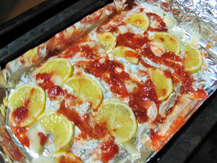 Покрываем рыбу соусом.