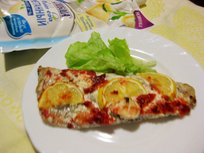 Для меня настоящим открытием стал майонез «Слобода» сметанный. Рыба с этим майонезом получается особенно нежной. Я готовила филе скумбрии, но можно взять и другую рыбу.