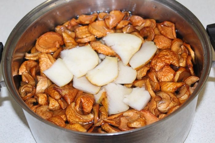Залейте холодной водой, поставьте на огонь, доведите до кипения. Добавьте дольки свежей груши, проварить 3 — 4 минуты. Добавить ложку меда.