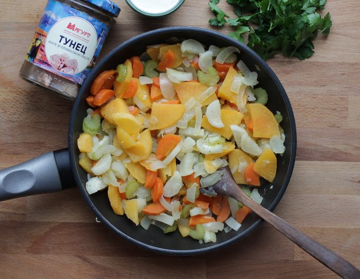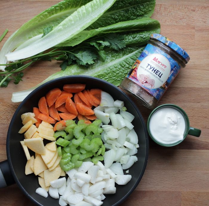 Коренья и зелень вымыть, очистить. Нарезать средними дольками репу, дайкон, морковь, лук и сельдерей.