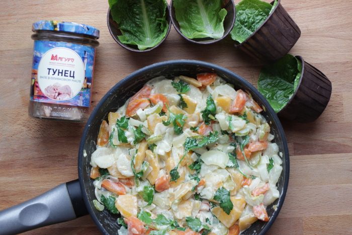 Влить в сковороду сливки и добавить петрушку, подержать на слабом огне 3 — 4 минуты. Тем временем подготовить посуду (или, как у меня, порционные стаканчики) для сервировки, выстелив дно листьями салата.