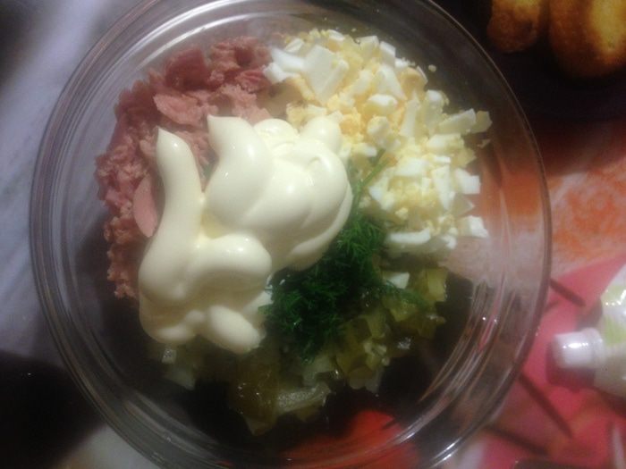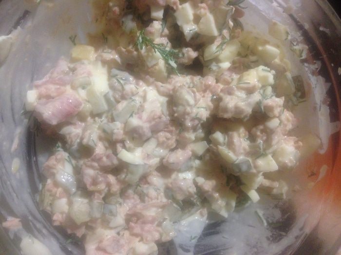 Режем мелким кубиком яйцо, огурцы. Тунец размять вилкой. Зелень мелко крошим.