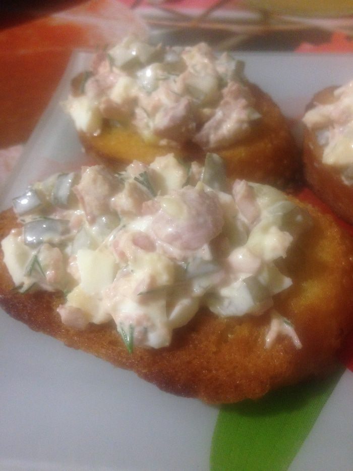 Выкладываем нашу закуску на багет. Его предварительно можно натереть чесноком. Приятного аппетита!