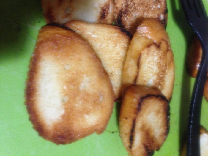 С двух сторон обжариваем кусочки багета примерно по 1 см толщиной на растительном масле.