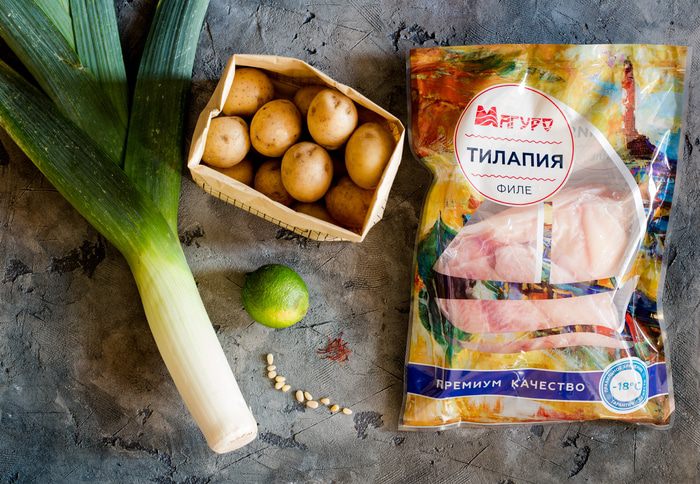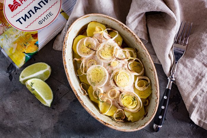 В форме для запекания равномерно распределите по дну картофель, на него выложите филе тилапии, полейте соком лайма, затем выложите лук-порей и посыпьте кедровыми орешками. Поперчите и немного посолите. Запекайте в разогретой духовке 15 минут. Подавайте, украсив рубленым укропом.