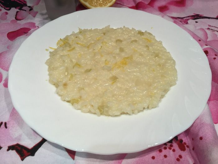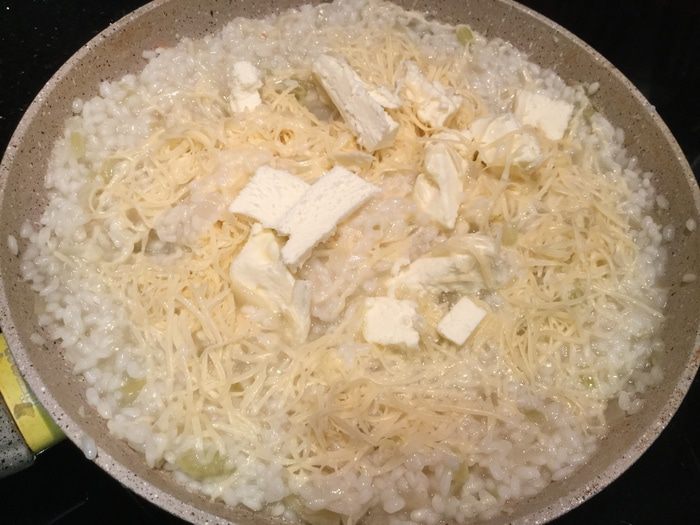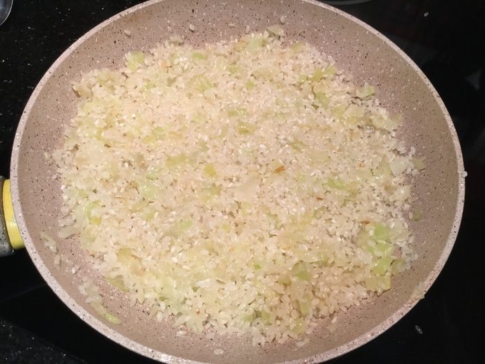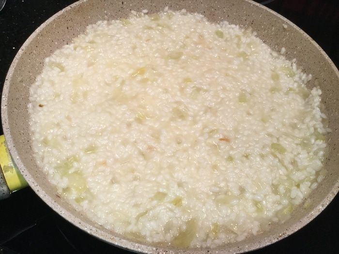 Как только пропадет резкий алкогольный запах, и вермут частично выпарится, а частично впитается в рис, добавьте половник бульона и щепотку соли. Убавьте огонь. Продолжайте готовить, постепенно по половнику добавляя бульон, постоянно перемешивая рис. Этот процесс займет около 15 минут. Добавляя новый половник бульона, убедитесь, что предыдущий полностью впитался в рис. Рис должен стать мягким, но при этом не превратиться в кашу.