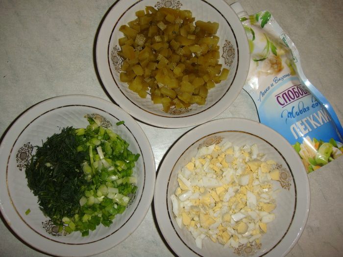 Лук и укроп мелко порубить. Соленые огурцы нарезать кубиками. Яйца отварить, с двух снять белок и отложить его. Яйцо и два желтка нарезать кубиками.