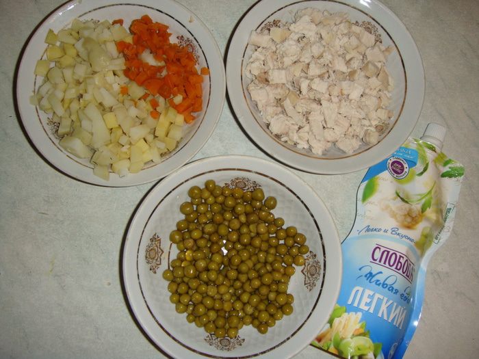 Куриное филе отварить и нарезать кубиками. С зеленого горошка слить рассол. Отварные картофель и 50 г моркови нарезать мелкими кубиками.