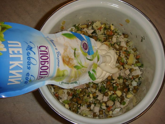 Смешать все нарезанные ингредиенты, посолить по вкусу и заправить майонезом Легкий ТМ «Слобода».