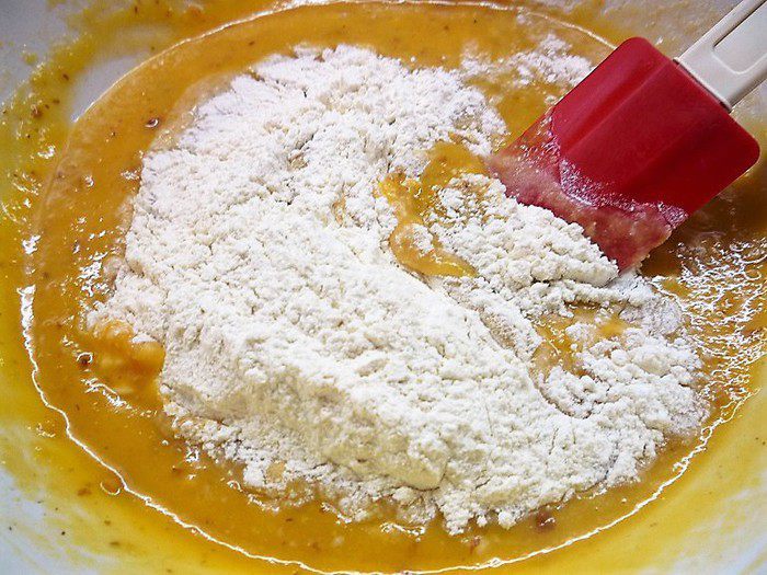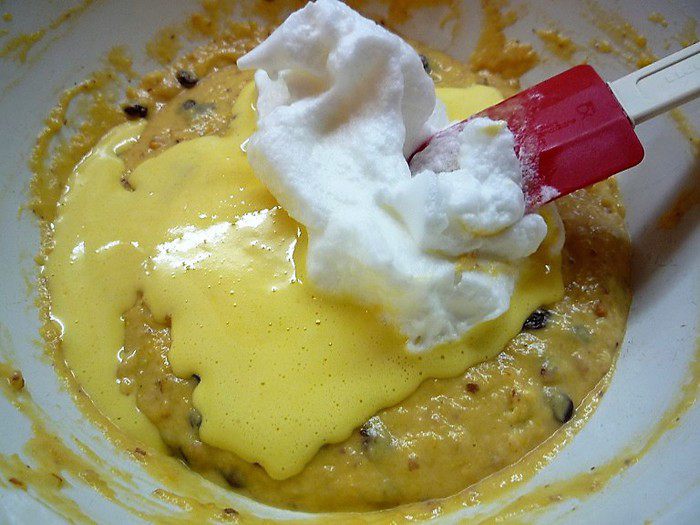 Добавляем желтки с белками небольшими частями в тесто, аккуратно перемешивая.