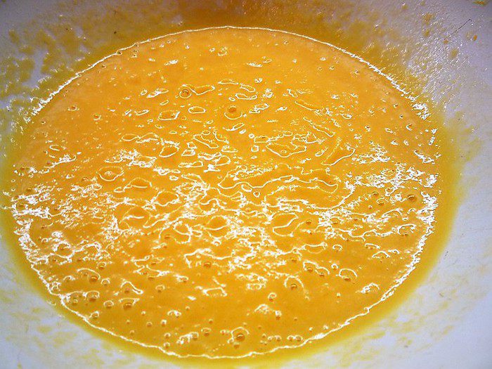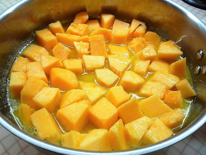 В глубокой сковороде растапливаем сливочное масло. Выкладываем очищенную и нарезанную небольшими кусочками тыкву и томим ее в масле на медленном огне 10 — 15 минут.