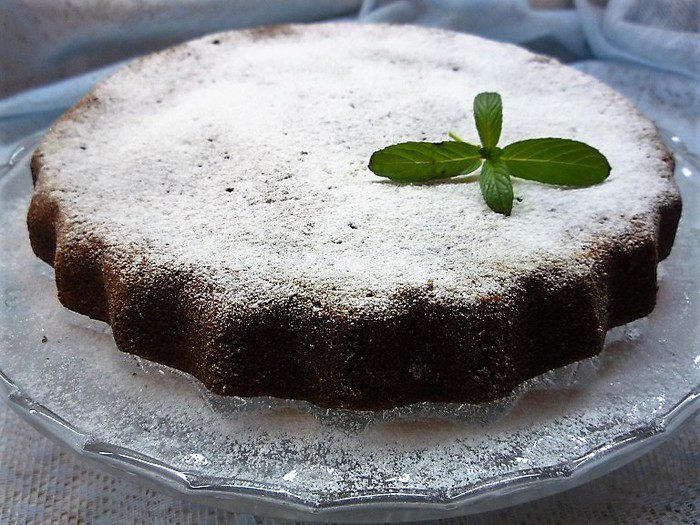 Готовый остывший пирог посыпаем сахарной пудрой и украшаем листиком мяты.