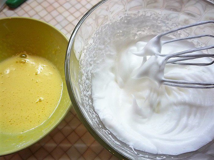 Белки отделяем от желтков. Желтки взбиваем добела. Белки взбиваем в крепкую пену.