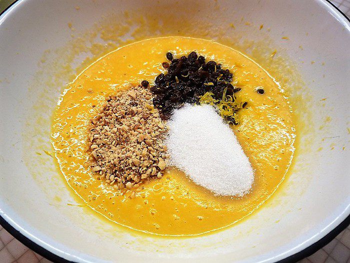 К тыквенному пюре добавляем рубленый миндаль, сахар, лимонные цукаты, лимонную цедру и вымоченный в граппе изюм. Аккуратно перемешиваем.