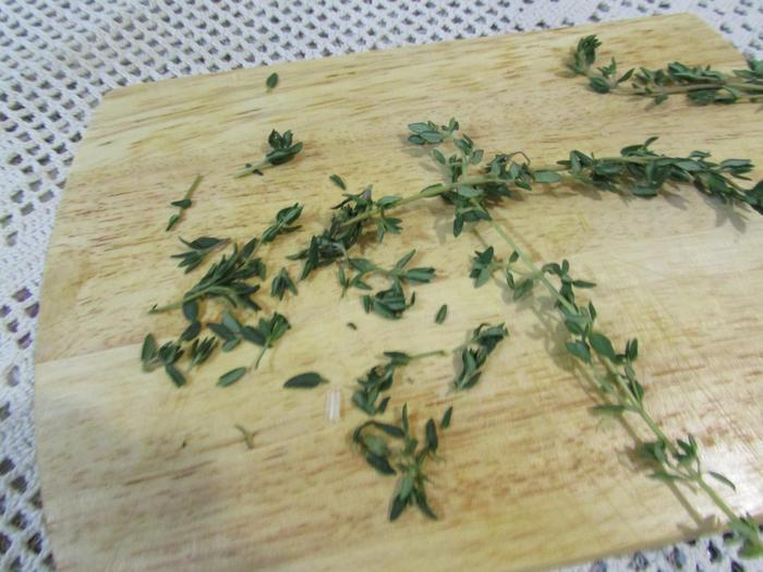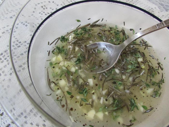 В миске соединить лимонный сок, чеснок, тимьян и розмарин. Поперчить и посолить. Хорошо перемешать.