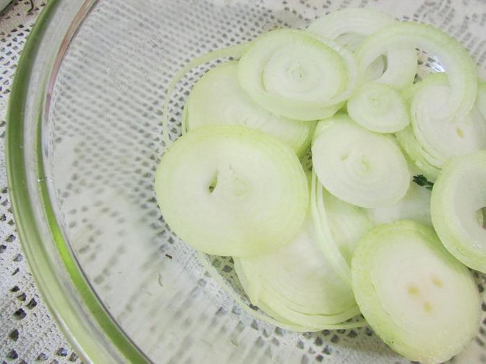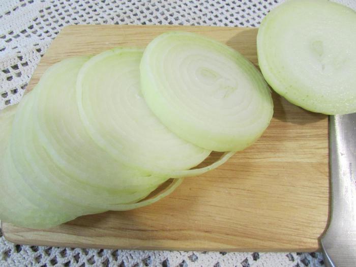 Этим временем почистить репчатый лук. Нарезать кольцами.
