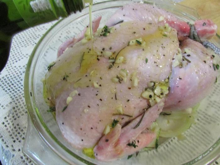 На лук выложить цыпленка (обязательно связать ножки). Затем залить цыпленка оставшимся маринадом, хорошо сбрызнуть оливковым маслом.