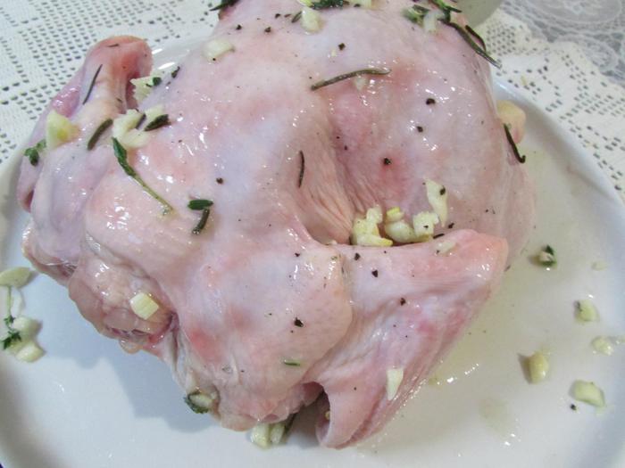 Цыпленка хорошо смазать маринадом изнутри и снаружи. Оставить на несколько минут.