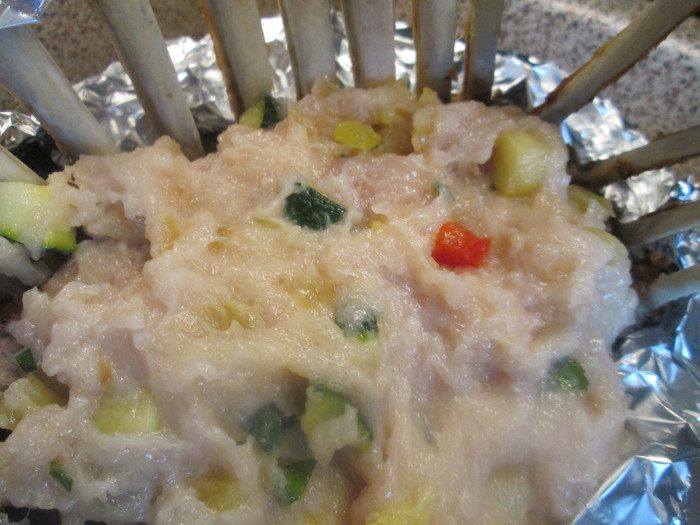 Если у вас не удалена внутренняя кожа, запекать нужно по-другому: сначала запечь корону без начинки и без косы 40 минут, а потом заполнить начинкой и добавить косу, как я и сделала: в форму для запекания на пекарскую бумагу поставила каре. Ребрышки сверху прикрыла фольгой, чтобы не погорели.