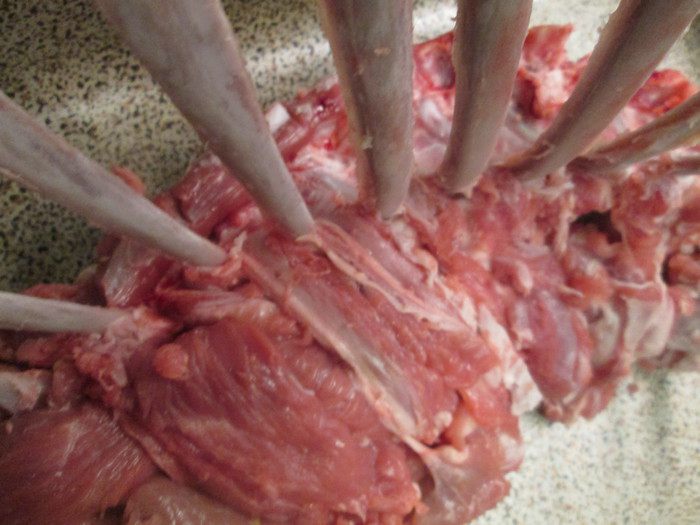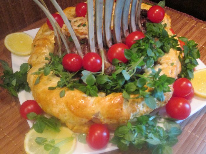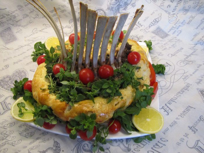 Когда ребрышки будут очищены сворачиваем их, делая кольцо — мясо вовнутрь, но дно должно быть пустым (гнездо не делать). Делая «корону» из двух каре, соединяем таким же образом.