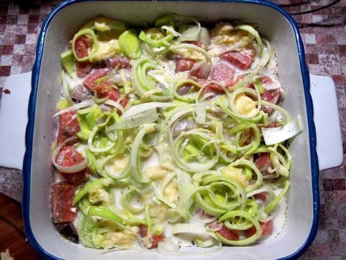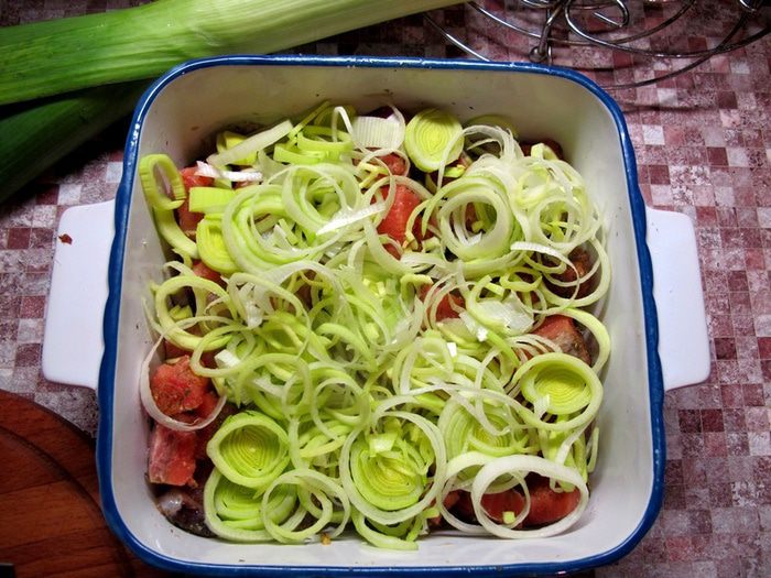 Лук-порей нарезать колечками и выложить поверх рыбы.