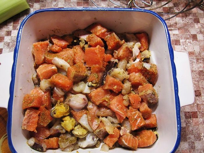 Морской коктейль разморозить, лосося ТМ «Магуро» нарезать небольшими кубиками. Все сложить в жаропрочную посуду для запекания, посолить, посыпать специями для рыбы, полить лимонным соком.