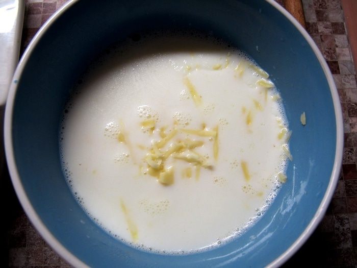 Молоко нагреть примерно до 60°С. Сыр натереть. Половину сыра положить в молоко, туда же добавить муку и хорошо размешать.