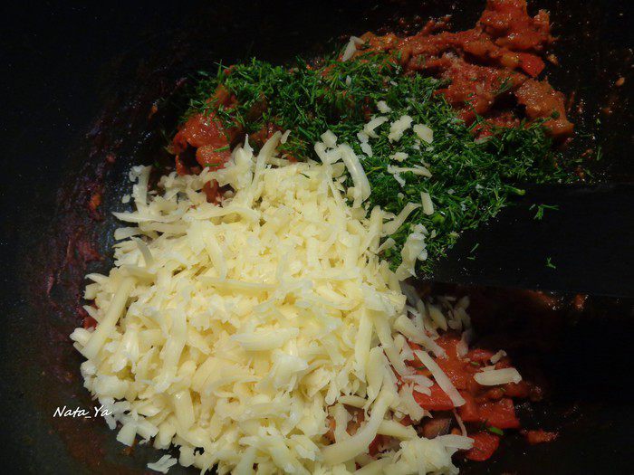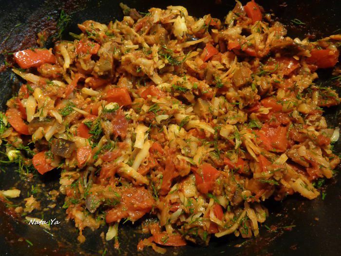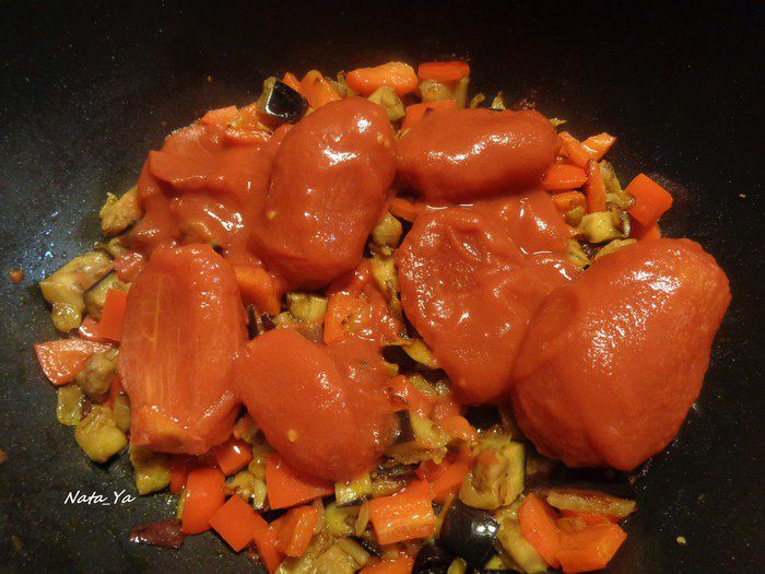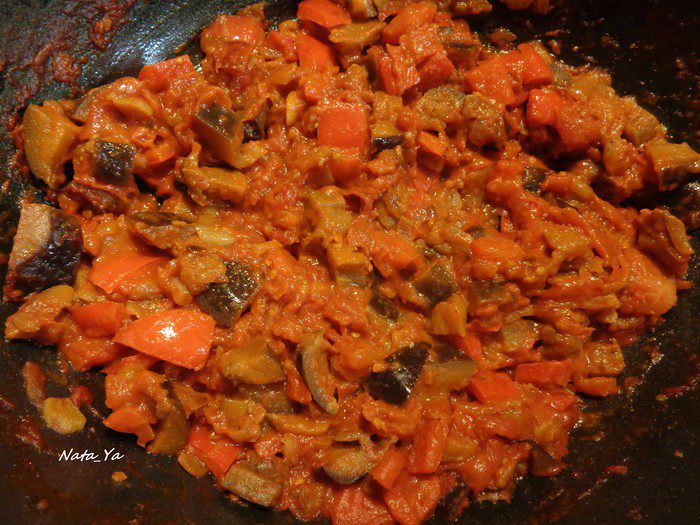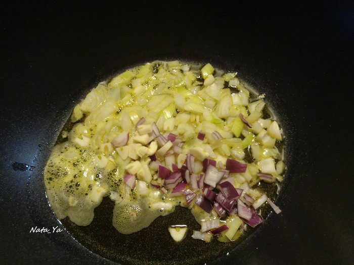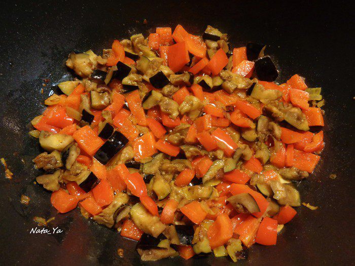 Я всегда так делаю, это помогает баклажану не впитывать так много масла, как обычно. Луковицу и чеснок порезать и отправить пассироваться в растительном масле до светло-золотистого цвета. У меня попал под раздачу и красный лук.