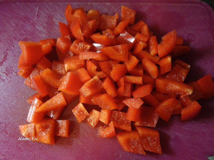 Баклажан порезать кубиком, присыпать солью, пожмякать немного и отставить на 20 минут.
