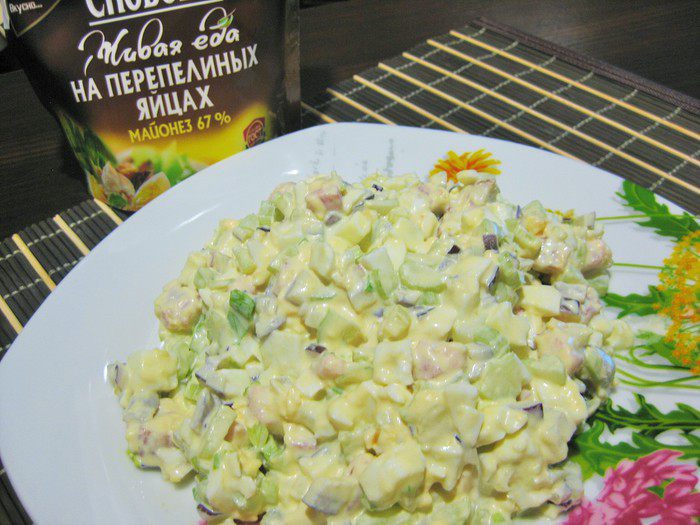 Рекомендую приготовить к праздничному столу этот несложный салат. К нему прекрасно подошел майонез ТМ «Слобода» на перепелиных яйцах.