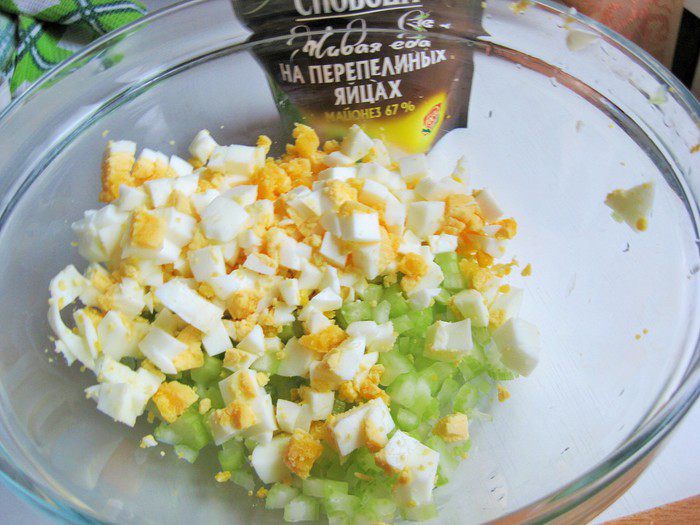 Яйца отварить, очистить, нарезать кубиками, добавить к сельдерею.