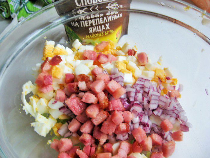 Добавить грудинку и мелко нарезанный красный лук. Посолить, заправить майонезом.