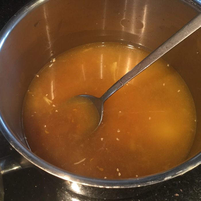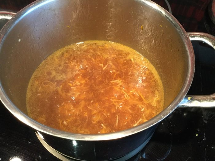 Смешайте в сотейнике сок и цедру, бульон, соевый соус и винный уксус.