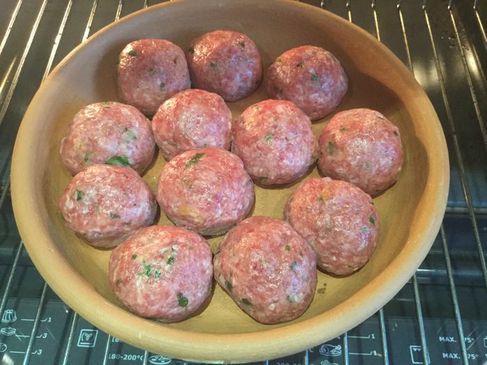 Сформируйте тефтельки размером с грецкий орех, выложите в форму, поставьте в духовку и готовьте 15 минут.