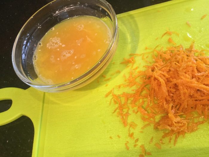 Натрите на мелкой терке цедру апельсина и выжмите сок.