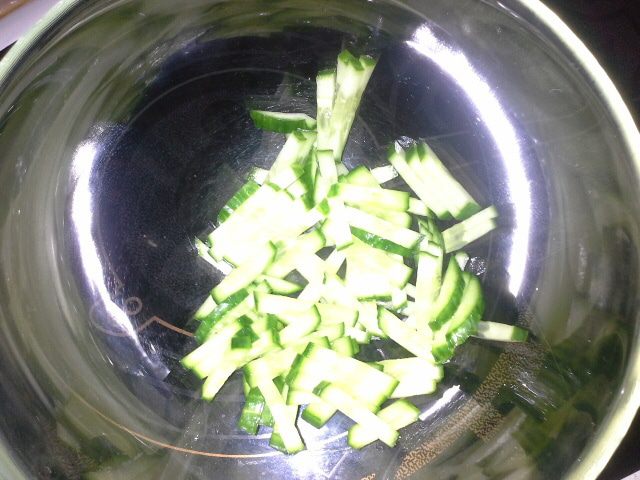 Огурец режем соломкой и складываем в миску.