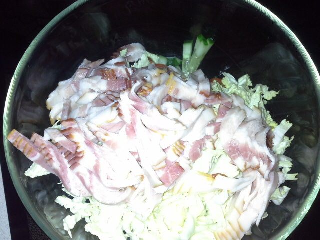 Пласты бекона тоже режем соломкой.