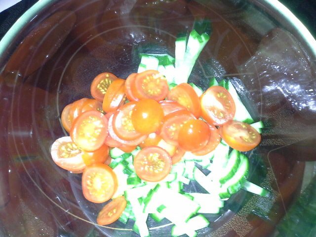 Помидорки черри режем кружочками (примерно на 5 — 6 кружочков каждая помидорка).