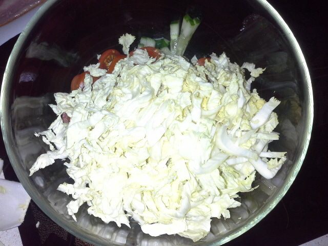 Моем огурец, помидорки. Капустные листья отрываем от кочана и вырезаем толстую серединку.