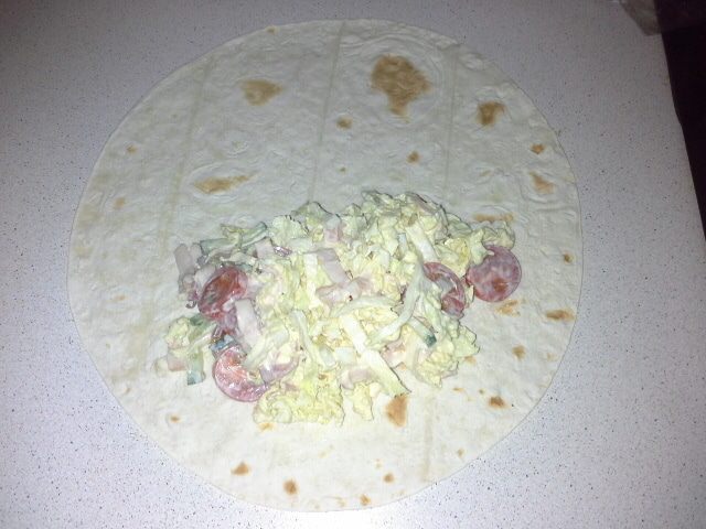 Выкладываем 1/5 начинки на лаваш и заворачиваем.