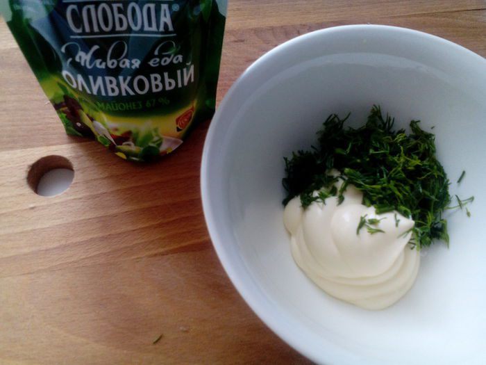 В миске смешать майонез оливковый ТМ «Слобода», мелко нарубленную зелень, 1 ч. л. соли, поперчить, перемешать. Добавить смесь к картошке, перемешать.