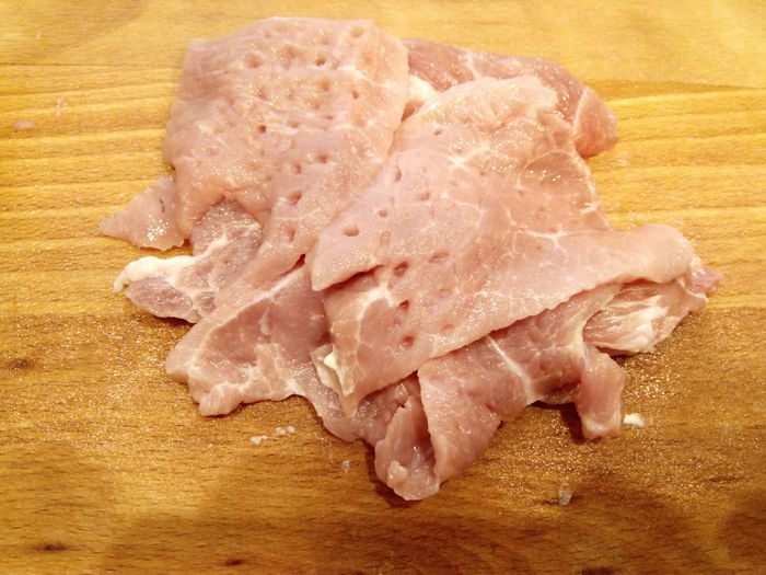 Мясо нарезать на пластинки, отбить. К мясу добавить сок лимона, 1 ч. л. соли, поперчить, перемешать. Мариновать 20 минут.