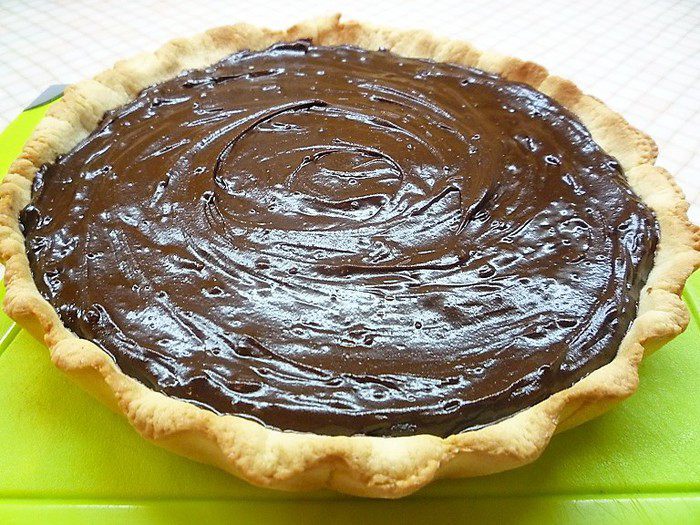 Заливаем в нишу остывшего коржа шоколадный крем. Аккуратно разравниваем.